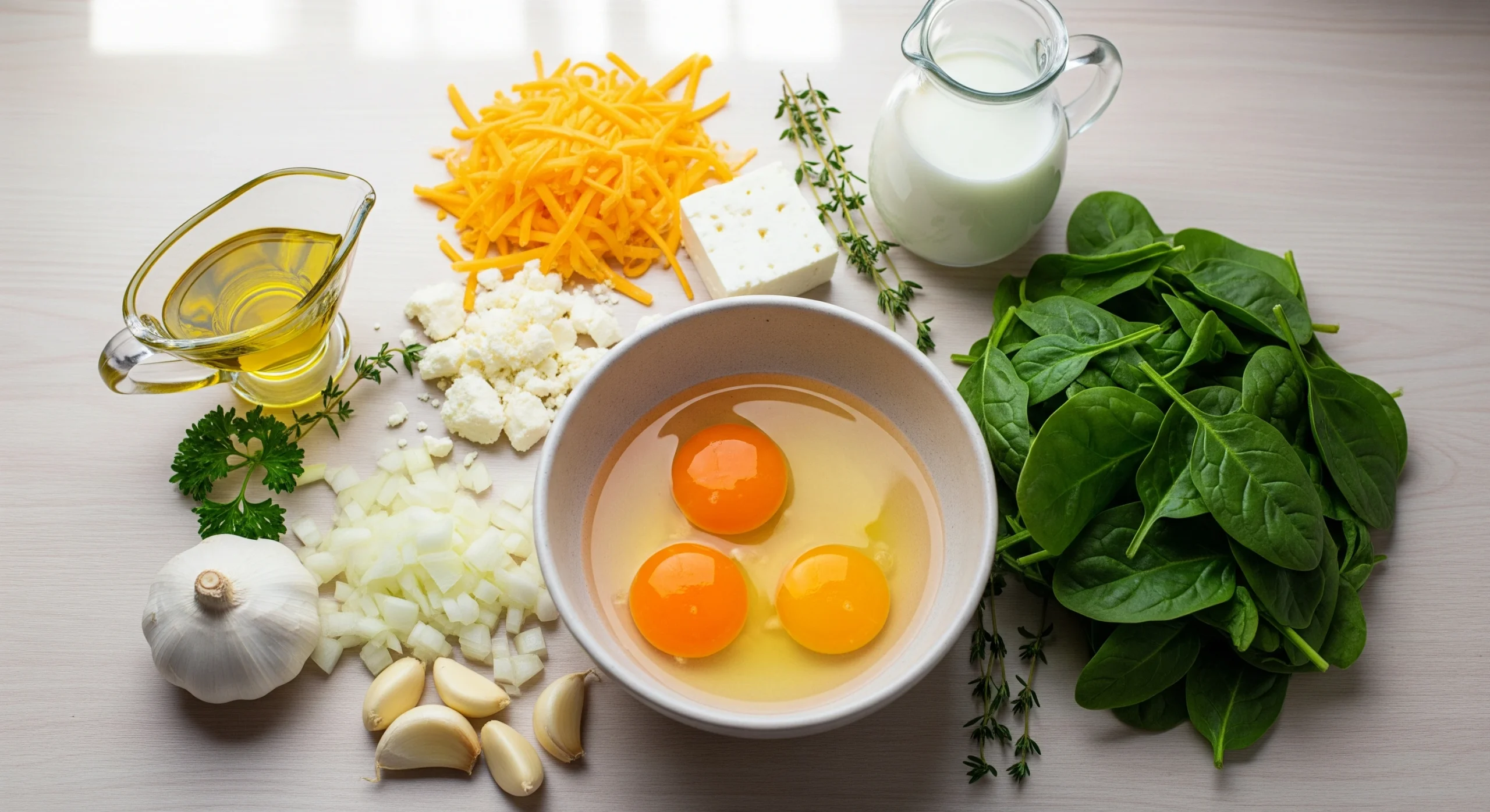 - Combine everything: Fold the sautéed spinach and onions, sun-dried tomatoes if using, shredded cheddar, and crumbled feta gently into the egg mixture.